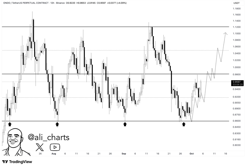 Ondo Finance原生代币($ONDO)在坚守0.86美元关键支撑位后持续企稳,释放新一波看涨动能。据Ali_charts分析,该价格区域多次形成强需求区,帮助ONDO在近期波动后稳定在0.96美元附近。