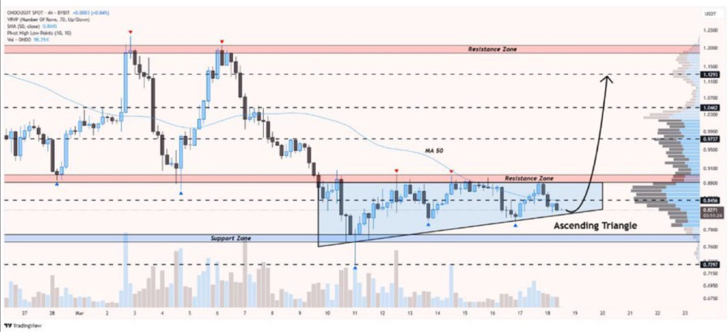 此外,ONDO在4小时图上正构筑上升三角形形态(通常视为看涨延续结构)。支撑区位于0.82-0.84美元区间,阻力位见于0.88-0.90美元——该位置恰低于50日均线(0.8466美元)。