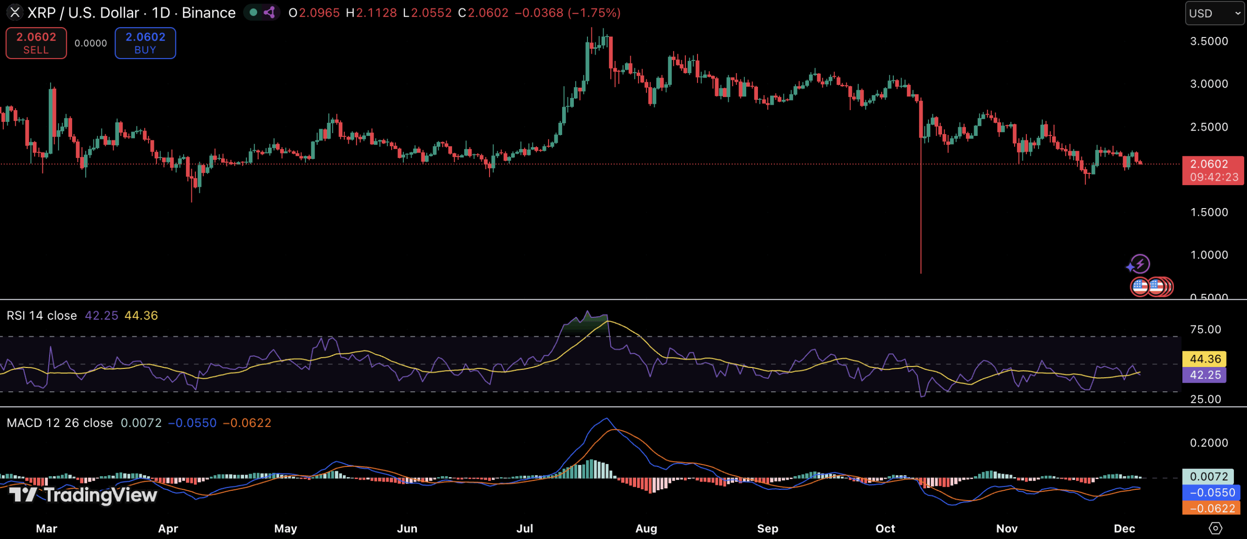 价格图表佐证了这种心理转变。瑞波币日线RSI处于40以下的低位区间,交易者通常视该区域为超卖而非趋势破位。与此同时,MACD柱状图在零轴下方逐渐走平——这是抛售动能衰退的早期信号。