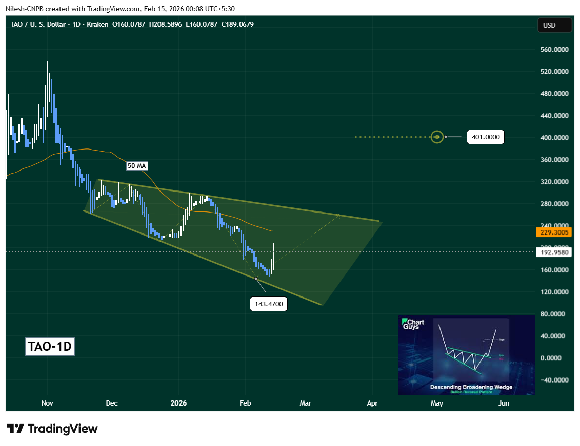 从日线图观察,TAO似乎正在形成下降扩散楔形——这是一种经典的看涨反转结构,通常出现在长期调整阶段。价格近期下探至楔形下轨约143美元附近,买盘在此处强势介入并守住支撑。这一反应推动TAO反弹至192美元区域。尽管当前价格仍低于50日移动平均线(约229美元),但从低点的急剧反弹暗示短期动能可能正在转变。