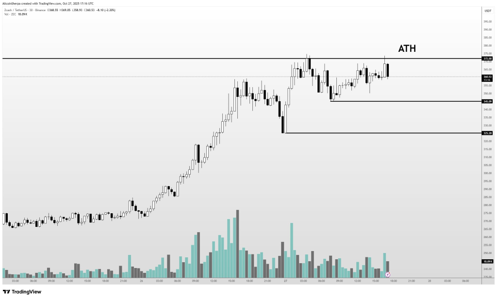 图表显示ZEC当前在345-375美元区间震荡,历史高点阻力位恰位于区间上沿。从300美元附近急速拉升后,ZEC价格开始形成横盘格局——虽保持强势但未能实现有效突破。Sherpa评论称这取决于个人风险偏好,交易者需抉择是坚守可能出现的回调,还是在动能减弱时获利离场。