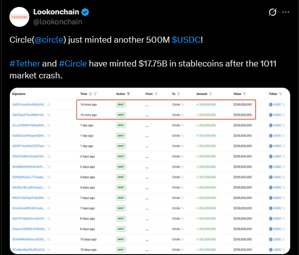 自十月市场暴跌以来,泰达公司和Circle已合计增发了177.5亿美元的稳定币。Circle近期新增了5亿枚USDC,反映出市场对稳定币流动性的持续需求。稳定币发行量的激增凸显了投资者在加密市场波动时期对稳定资产的偏好。稳定币供应量的增加可能会影响交易动态,为交易所提供流动性并支撑市场稳定。
