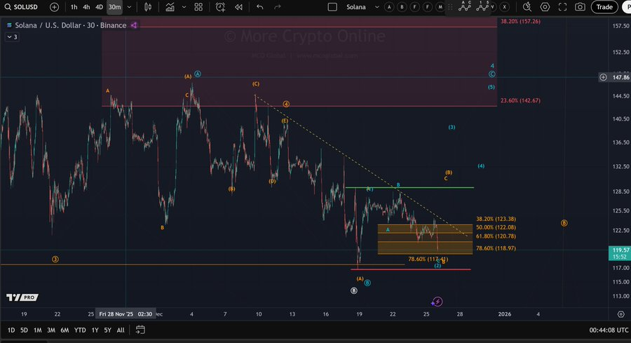 Solana(SOL)近期在118.97美元至123.38美元的狭窄支撑区域内交易。该区域基于关键斐波那契水平,其下限标志着78.6%的回撤位。价格最近触及此水平,但未出现强烈反应。