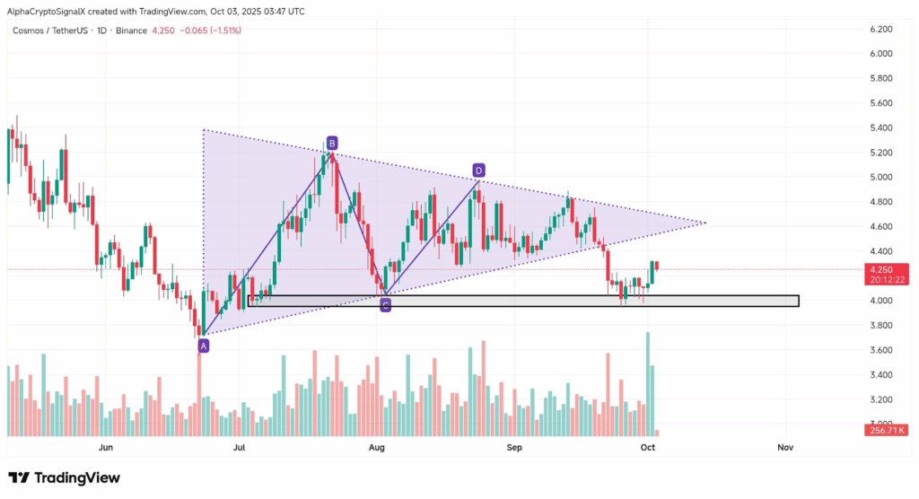 破位后价格并未立即暴跌,ATOM反而向4.0美元附近的水平需求区移动并引发买方介入。虽然形成技术性反弹,但在更强信号出现前整体格局仍需谨慎看待。
