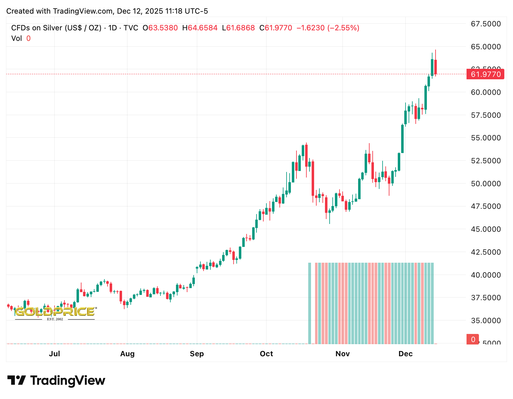 十二月白银一度飙升至每盎司64美元上方,随后小幅回调,最新日收盘价显示接近61.97美元。尽管出现短期回调,整体结构仍坚定看涨,这反映了希夫提到的急剧上行扩张。