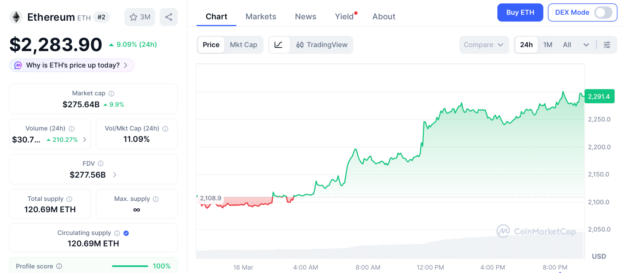 截至3月16日,以太坊交易价格为2283美元。主网主导地位的回归是对持有者极为利好的市场信号。