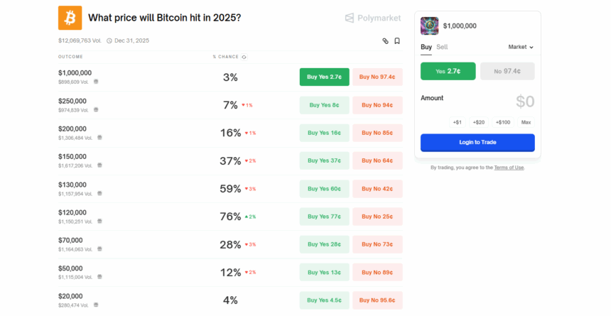 该预测事件于2024年12月31日开放交易,近期市场趋势与宏观经济发展助推了加密投资者的乐观情绪。尽管某些预测结果看似不合常理——例如比特币飙升至百万美元或暴跌至2万美元——但这些选项仍获得可观押注量。