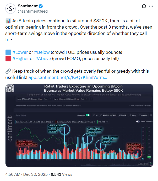 经历各大交易所全面抛售后,比特币近期持续承压。Santiment研究发现,群体行为在此类时期能提供有效信号。该分析机构观察到短期价格走势常与主流预期相悖。通过追踪过去三个月社交媒体内容,发现当交易员预测下跌时比特币往往反弹,反之则常出现回落。这种模式表明群体恐慌与乐观情绪可作为反向指标。