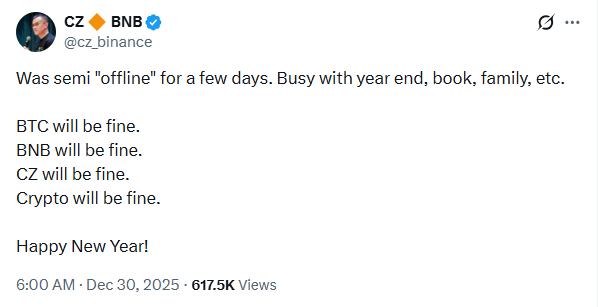 人称CZ的赵长鹏也就市场关切发表看法。这位币安创始人在短暂离开后重返社交媒体,表态称尽管近期出现波动,比特币仍将保持稳健。他在市场经历数日不确定性和价格下跌后发布动态,表示比特币、BNB及更广泛的加密市场将逐步趋于稳定。虽内容简短,但被视为行业领袖的重要信心宣示。