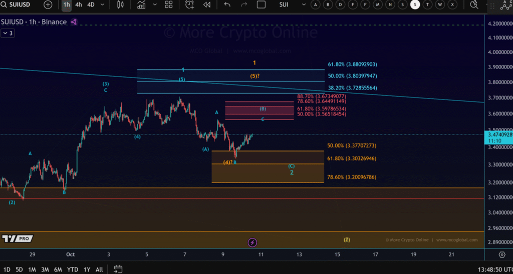 SUI稳定维持在3.20至3.37美元支撑带上方,显示出更大级别B浪结构的形成迹象。分析时币安平台报价显示,斐波那契回撤位50%-78.6%恰好对应当前支撑区,该区域历史上常成为价格重拾主趋势前的稳固平台。