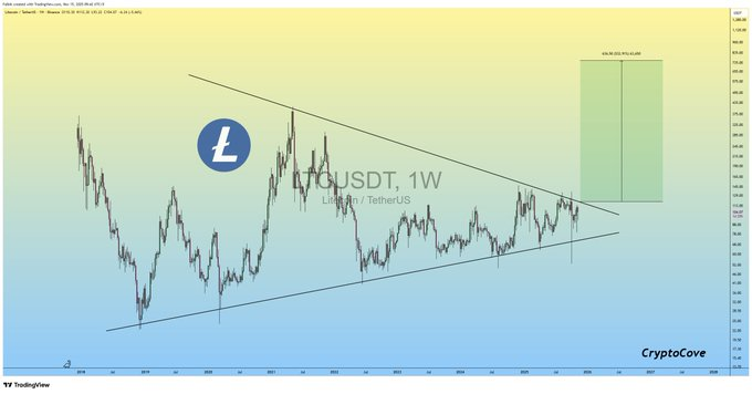 莱特币仍处于持续十年的三角形形态内,该形态持续影响着周线级别的市场情绪。分析师Captain Faibik在近期报告中指出,由于价格始终在趋势线间波动,这个结构已引发广泛关注。这种约束降低了波动性,形成了可控的交易环境。