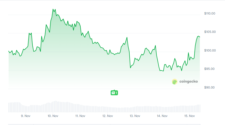 截至撰稿时,莱特币报103.82美元,周涨幅达3.8%。七日图表显示价格曾飙升至近110美元,随后出现有节制的回调至90美元中段区间。买家在94-96美元区间强势护盘,推动价格重返周线高位。