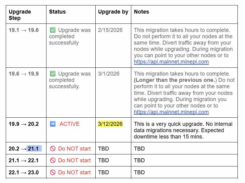 v19.9的完成,始于2026年2月15日v19.6升级的多阶段部署。v19.6升级主要聚焦于改善节点同步与性能。从v19.6过渡到v19.9最初定于2月27日,后为确保更广泛的节点协同与网络稳定,延至3月1日完成。