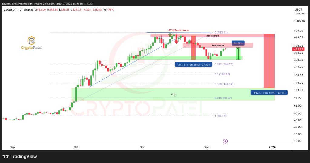 Crypto Patel将当前ZEC区间描述为市场必须在延续上涨与深度回调之间做出抉择的关键点。Zcash目前交易在428美元附近,K线仍处于红色阻力区下方的紧缩整理区间内。这使得任何突破或拒绝信号都比往常更具分量。