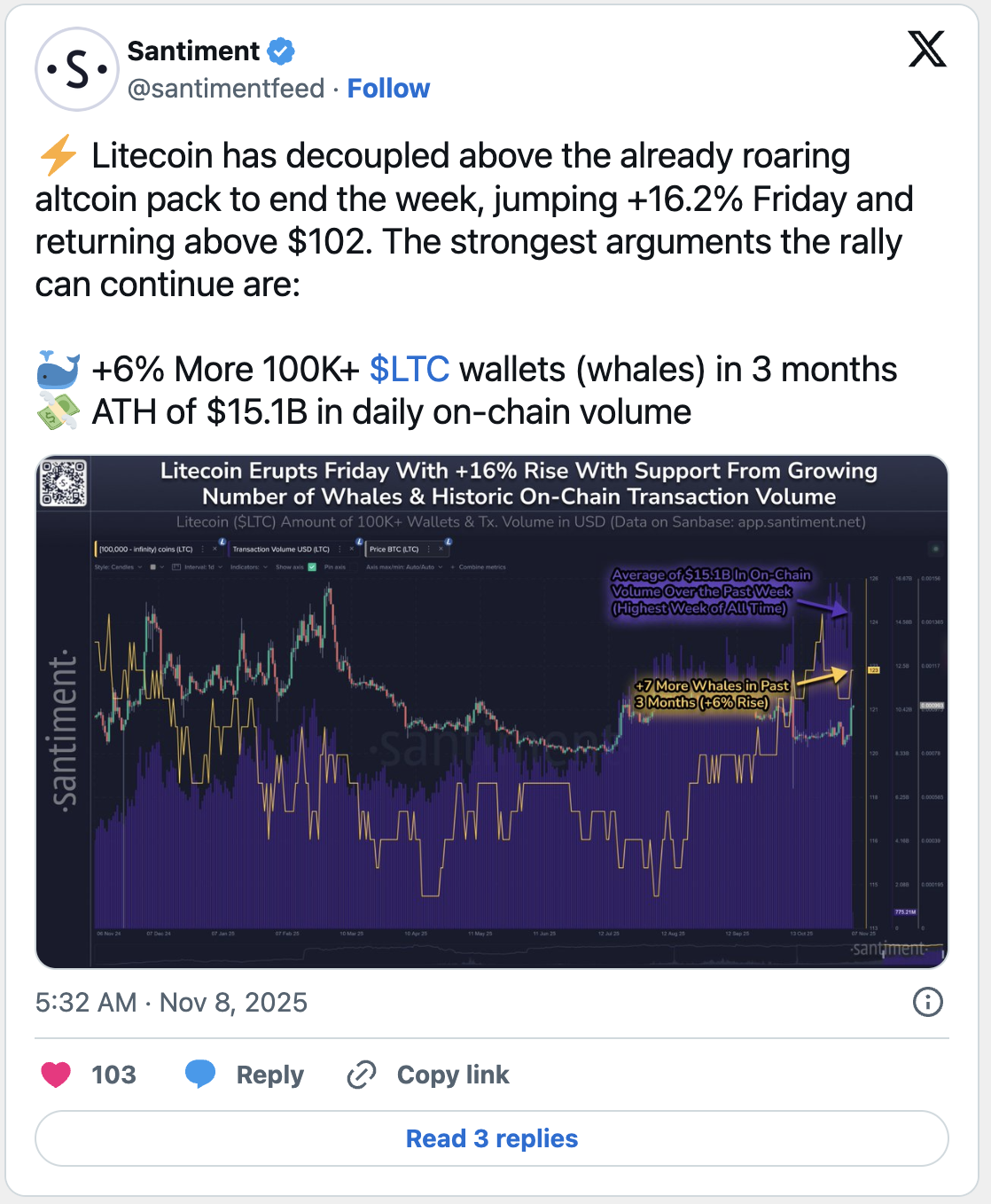 本周,莱特币(LTC)在关键指标支撑下成为加密货币市场的焦点。Santiment分享的数据显示,莱特币价格在24小时内从86.10美元跃升至104.46美元,最终稳定在约98.86美元,涨幅达11.26%。同期交易量激增约190%,达到17.3亿美元。此外,过去90天内持有10万枚以上LTC的钱包数量增长超6%,表明大额投资者正在持续积累。这一趋势推动该网络单日链上交易量创下151亿美元的历史新高。