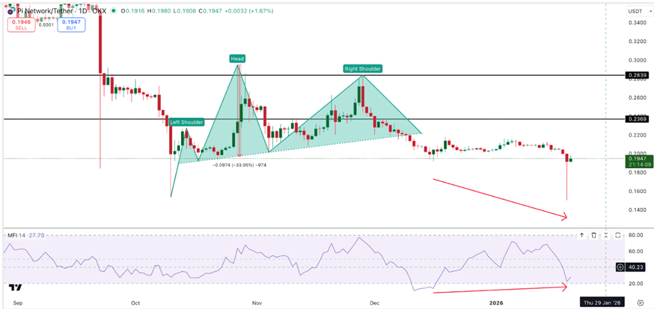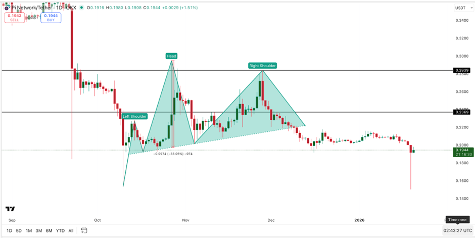 Pi币于12月初跌破头肩顶形态,该形态通常预示弱势格局。破位后价格呈阶梯式下跌而非直线下挫。根据图表测算,自破位点开始的预期跌幅为33%,当价格下探至0.15美元附近时已基本完成该目标。买盘在该水平做出强烈反应,K线长下影线显示需求正在此积聚。