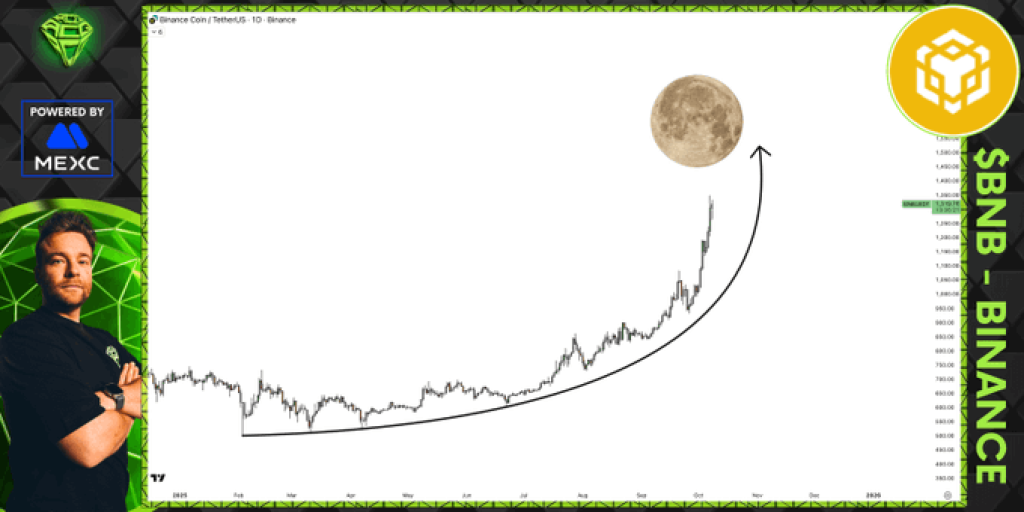 这个年初被众人唱衰的代币如今正领涨整个加密市场,且势头丝毫未减。当前BNB价格徘徊在1300美元附近,过去数周内实现了被分析师AltCryptoGems的Sjuul称为"抛物线式登月"的暴涨。如此凌厉的涨势甚至让资深交易员都措手不及。但根据Sjuul的最新图表分析,这或许只是征程的中点而非终点。