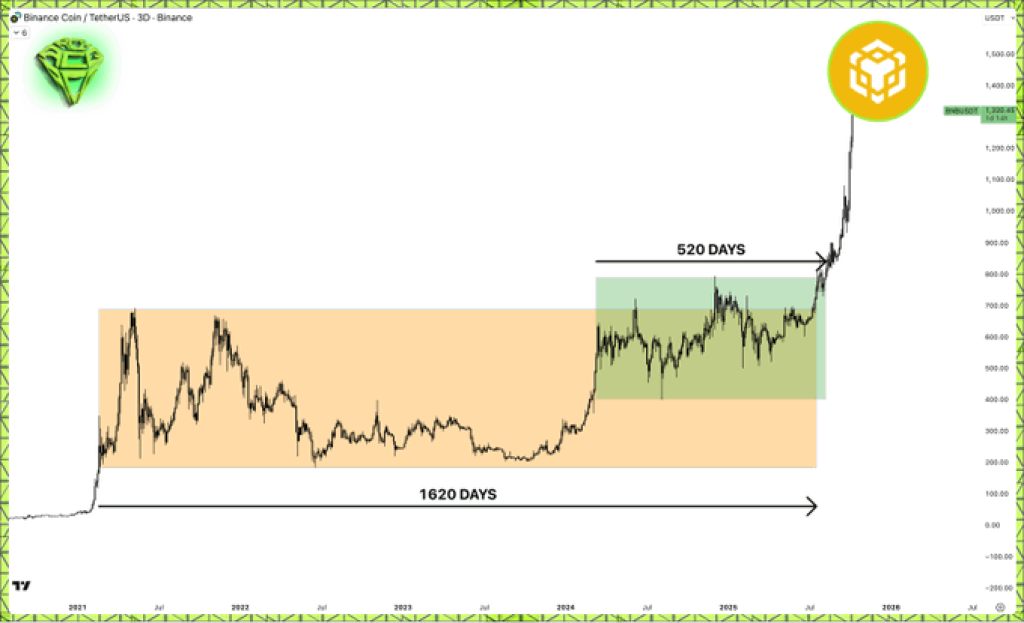 Sjuul指出,BNB的惊人涨势绝非偶然,这是两轮重大蓄势阶段积累多年能量的直接结果。第一轮吸筹周期持续约1620天,可追溯至BNB市场历史的早期阶段;第二轮虽然仅520天但同等重要。这两个阶段形成了巨大的基底,如今终于向上突破。