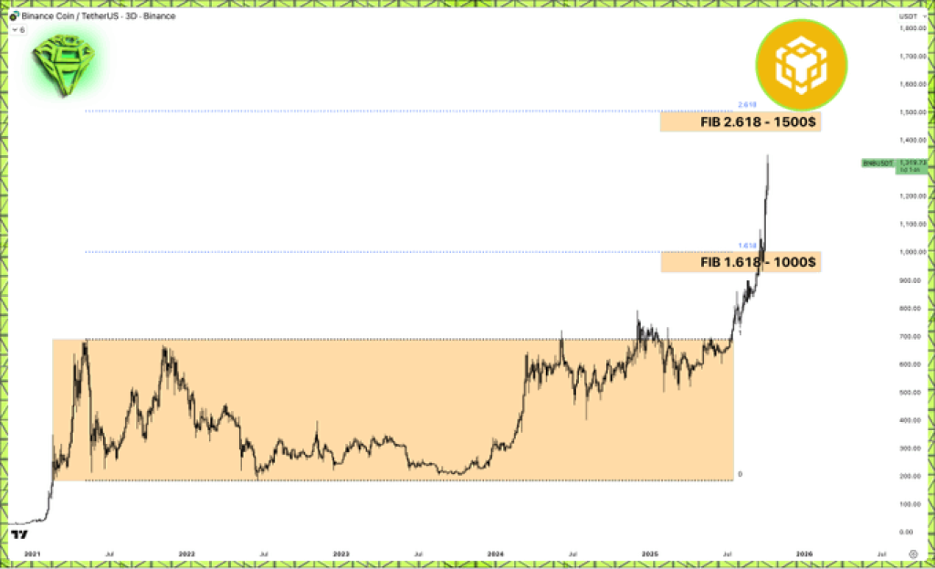 随着BNB突破历史高点,它正式进入了牛市中最激动人心(也最难以预测)的价格发现阶段。在没有历史阻力的情况下,斐波那契延伸位成为测算潜在目标的唯一工具。以长期盘整区间为基础,Sjuul指出2.618倍延展位1500美元将是下一个关键阻力。