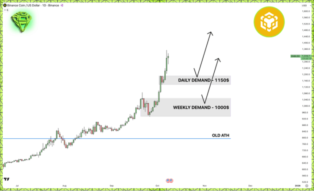 技术结构显示行情尚未结束。虽然1500-1550美元区间看似合理目标,但过程必然充满波折。向1150或1000美元的健康回调可能为下一轮上涨创造机会。无论如何,这是BNB的历史性时刻——不是简单的拉盘,而是酝酿1600天的终极突破。历史表明,这种量级的积累从不会悄然落幕。
