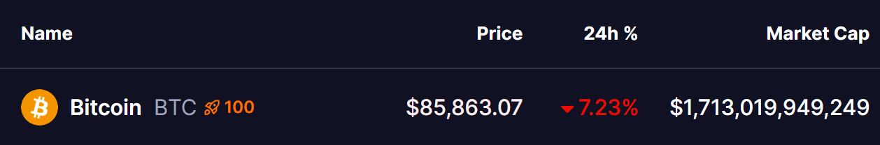 旗舰加密货币比特币在过去24小时内再度下挫7%,截至发稿时报85,863美元。此次下跌延续了自10月126,080美元峰值以来的深度回调,抹平了2025年全部涨幅,并引发全市场剧烈波动。