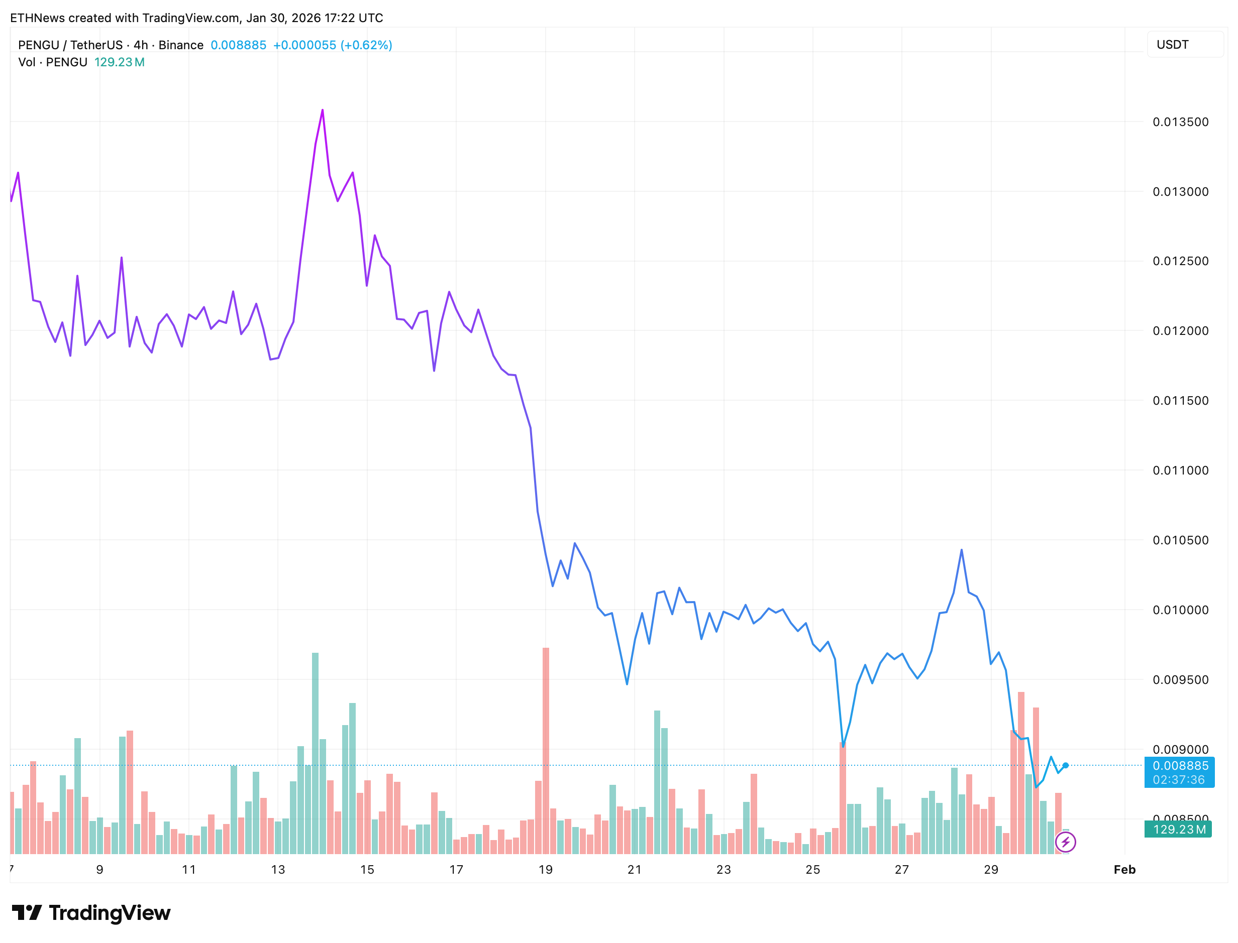 根据图表数据及Ali Martinez的技术分析,市场正接近一个决定后续方向性走势的关键节点。在币安4小时图上,PENGU现报约0.0089美元,自一月中旬高于0.0130美元的高点持续下跌。