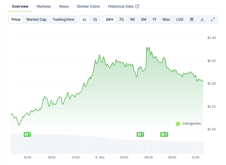 截至发稿时,CoinGecko数据显示XRP报价2.31美元,24小时上涨3.49%,但周跌幅仍达10.52%。
