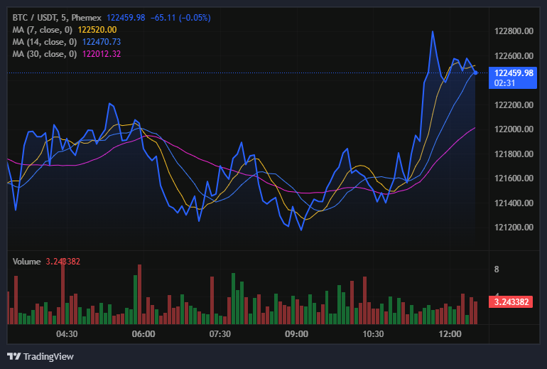 比特币目前保持稳定态势,价格维持在创纪录高位水平,这表明交易者正在进行有序盘整,等待突破122,800美元上方的关键阻力位。短期均线虽呈现微弱看涨倾向,但动能不足且依赖高交易量支撑。