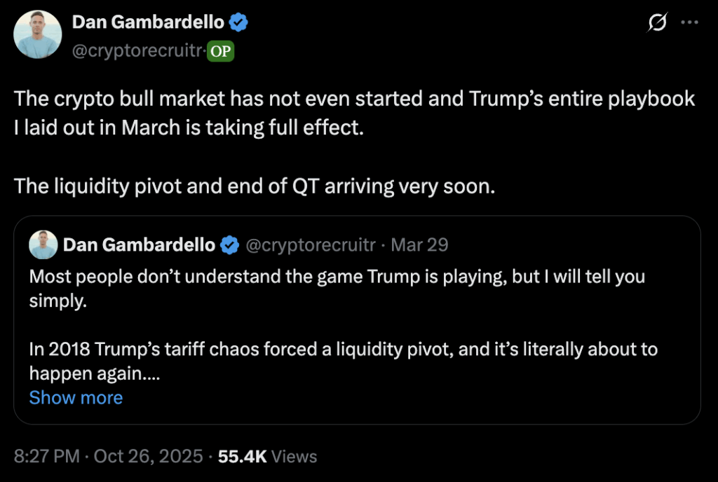 Gambardello解释道,美联储对2018年特朗普关税政策的反应比关税本身更具影响力。随着鲍威尔最终妥协,美联储转向宽松政策,量化紧缩宣告结束。分析师认为2025年第四季度将遵循相似轨迹——特朗普实施对等关税的同时确保美国贸易利益。