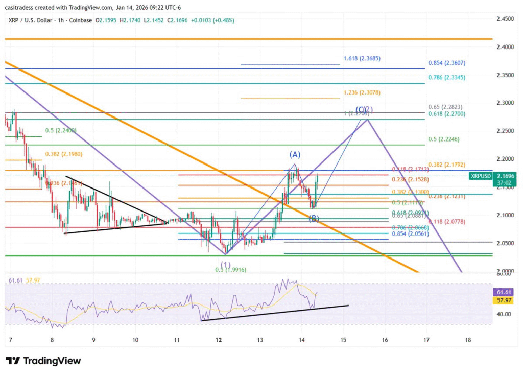 XRP近期价格走势表现坚挺,从低位反弹后持续企稳于2.10美元关口之上。过去24小时内,其价格从2.05美元附近显著攀升至2.18美元上方,随后稳定在2.14美元区域,创下自一月初以来最强波动。当前XRP正进入C浪阶段,分析师密切关注2.26美元回撤位这一关键技术点位。此前该加密货币的A浪与B浪已构成近乎完美的波浪结构,预示着C浪将对未来方向起到决定性作用。