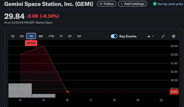 在纳斯达克交易所挂牌的Gemini股票周二收盘下跌约6%,报30.42美元。该股上周五以每股28美元的发行价上市后,首日交易曾一度飙升至45.89美元高点。但随着市场情绪降温,其股价已从峰值回落超34%,早期涨幅尽数蒸发。