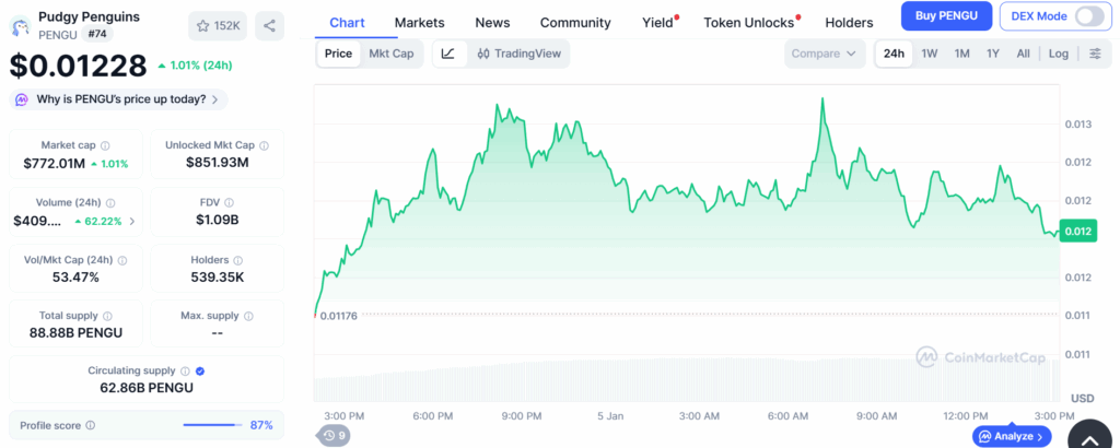 PENGU当前24小时交易量激增62.22%,市值显著增长1.01%。近期市场关注度自2025年11月开始升温,价格在0.013美元区间波动时曾存在触及0.023美元的潜力。