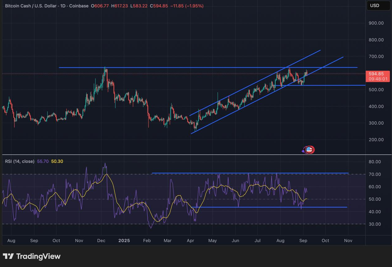 8月下旬BCH曾短暂跌破通道并测试更低点位,但迅速收复失地。此次反弹同时在525美元附近建立了新支撑区,该位置此后成为买盘关键防线。