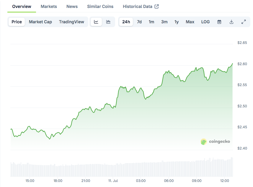 CoinGecko数据显示,XRP现报2.60美元,24小时交易量超过64亿美元。过去24小时上涨5%,周涨幅达17%。这种势头反映出市场兴趣增长,可能源于突破行情及加密市场整体机构关注度提升。XRP后续走势取决于其能否站稳2.60美元支撑位。