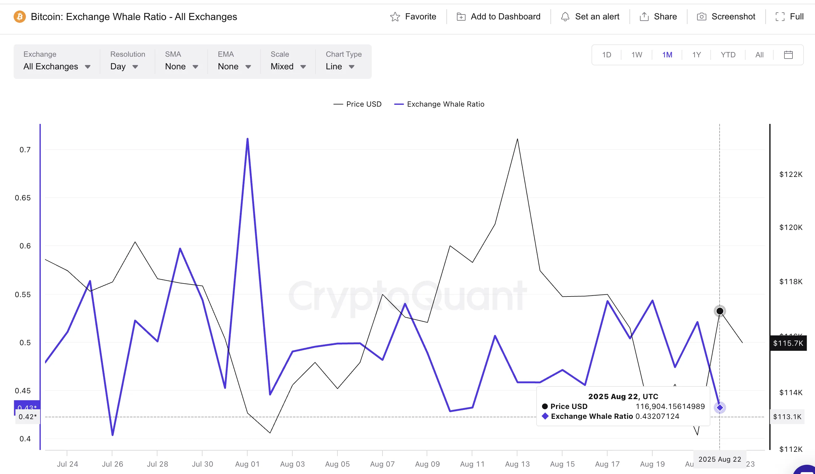 反之,若跌破114,100美元(特别是111,900美元),短期内走势将转弱。若交易所鲸鱼比率重现8月10日形态,比特币价格有望从当前水平上涨近4%,突破119,000美元进入突破区间。届时市场或将重探历史高点,印证本轮上涨只是延迟而非终结。