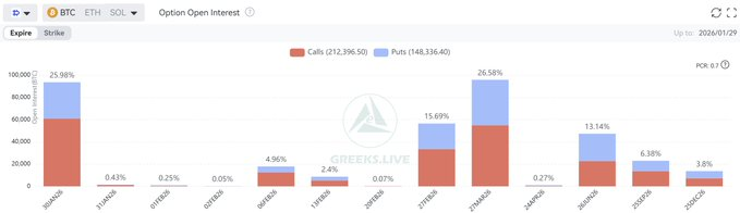 根据GreeksLive分享的数据,随着加密货币市场步入2026年首次月度期权到期,比特币的交易区间持续收窄。超过25%的未平仓期权头寸将于明日到期,但截至目前,价格走势仍相对平稳。分析人士指出,这主要是因为短期内并无重大市场波动事件,且美联储已维持利率不变。