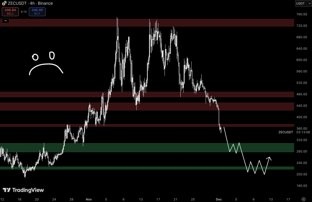 观察 Spermix 的图表可以清楚看到,ZEC 正在跌破关键支撑位。从当前约 340 美元的价格来看,这波下跌可能会使价格低至 200 美元。这个 200 美元关口可能成为下一个主要支撑位,买家或许会在此介入。