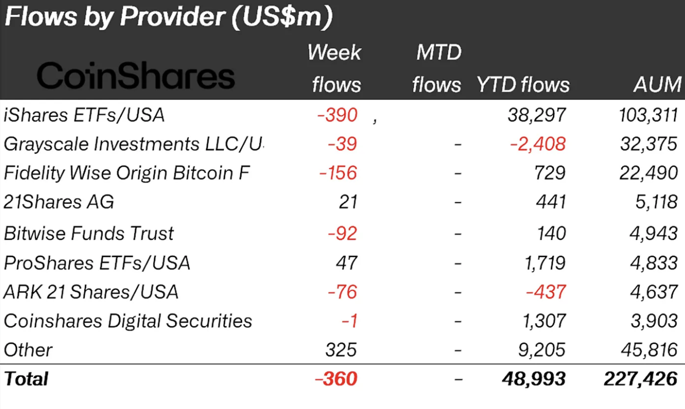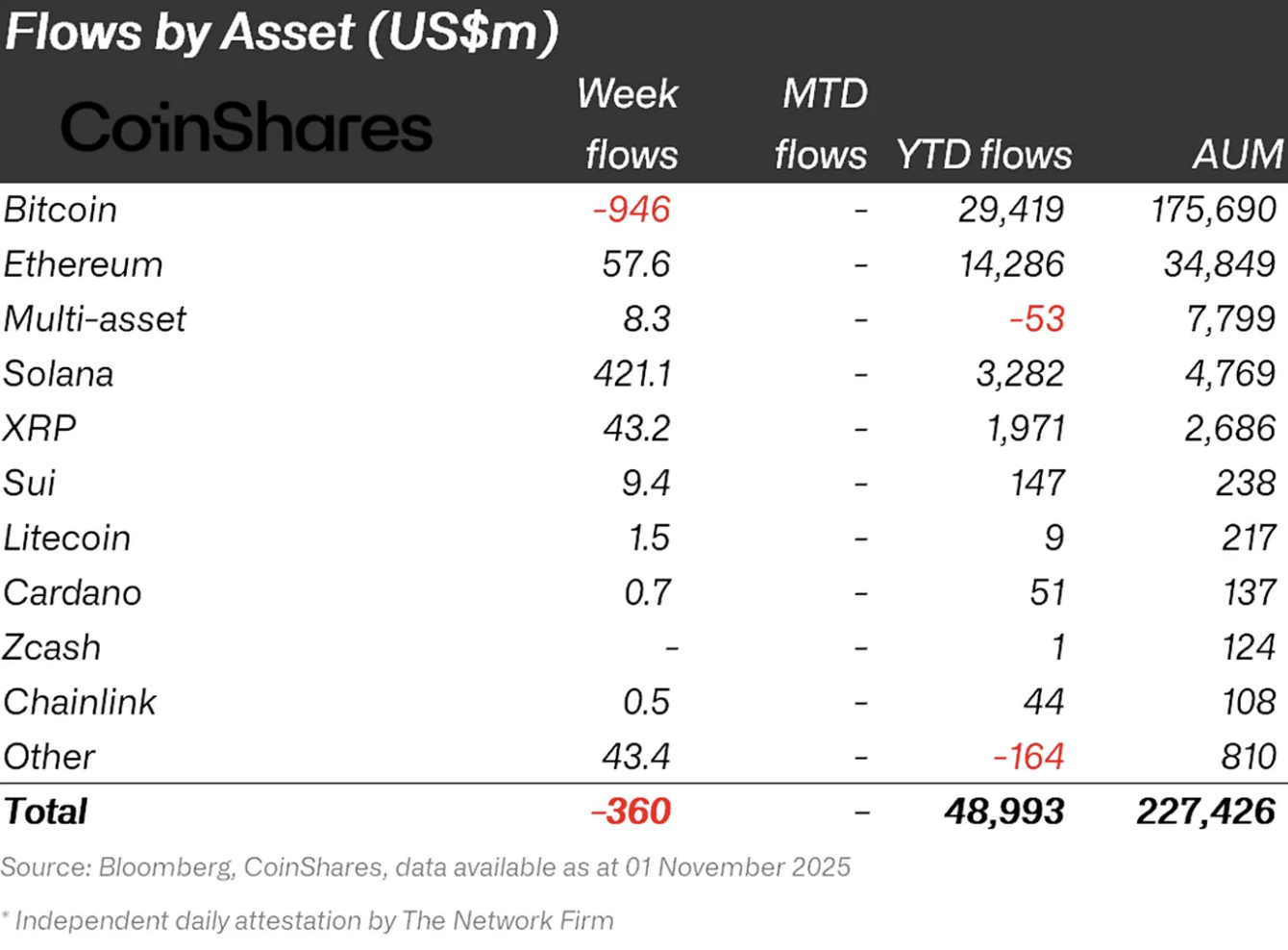 美国主导全球资金外流,投资者撤资4.39亿美元,占当周总流出量的绝大部分。德国(3200万美元)和瑞士(3080万美元)的温和流入部分缓解了压力,但不足以抵消美国市场的疲软。