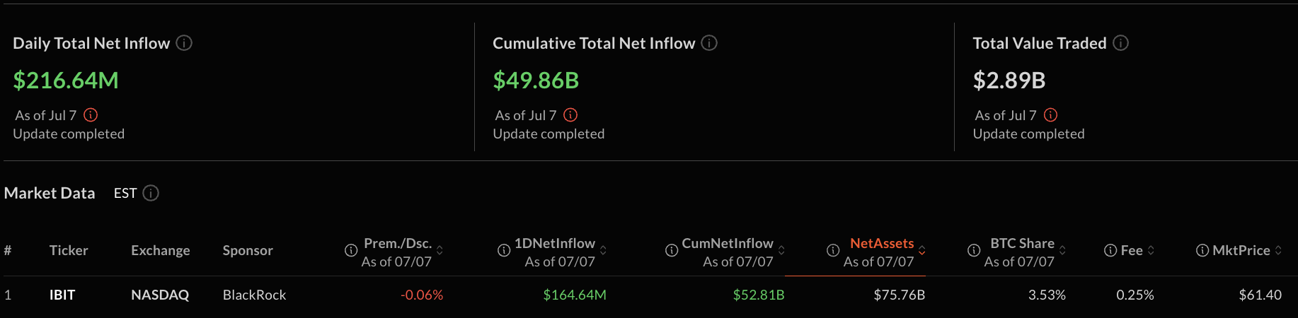 7月7日最新数据显示,IBIT单日净流入资金达1.6464亿美元,使其自上市以来的累计净流入规模逼近500亿美元大关。即使在比特币价格震荡下跌至10.8万美元附近时,该ETF仍持续逢低买入,不断扩充其庞大的比特币储备。