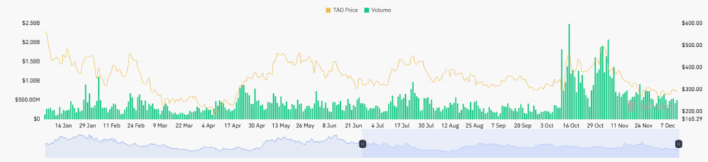 在现货成交量萎缩的情况下,未平仓合约逆势增长超7%,达到2.139亿美元。这种分化现象反映出市场在保持持仓的同时仍持谨慎态度。截至撰稿时,TAO交易价格为302.26美元,24小时交易量1.268亿美元,日内涨幅5.66%,周涨幅5.52%。整体交易量收缩期间的这波走势表明交易者正在等待市场催化剂。