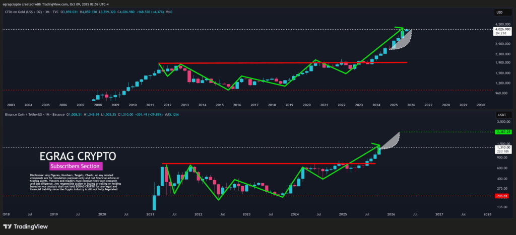分析师EGRAG Crypto发现BNB与黄金在3月/1月图表呈现联动:经历四年低于趋势线整理后,BNB于2月突破700美元关口,5月回调后再度上攻,当前已创1330美元历史新高。