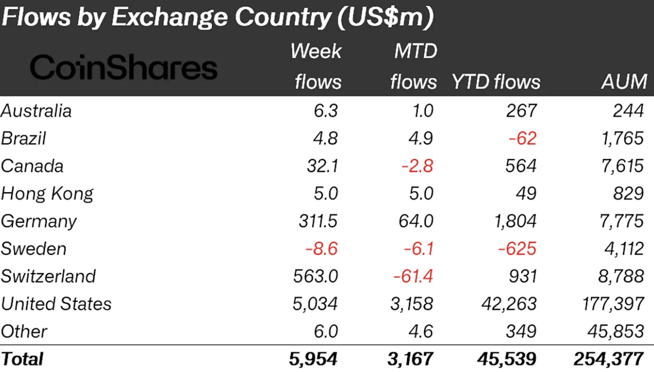 瑞士以单周5.63亿美元流入刷新纪录,德国则以3.12亿美元创下单周第二高流入量。这种广泛的区域分布表明,资金流入并非集中于单一工具,而是分散在多元化的投资组合中,显示出全球性的投资主题。