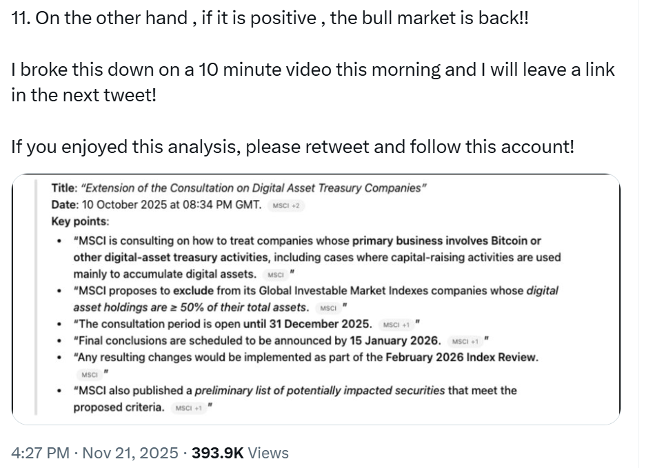 Crypto Banter的拉恩·诺伊纳在X平台发文中透露,2025年10月10日,MSCI宣布将重新评估对MicroStrategy这类公司的归类标准。
