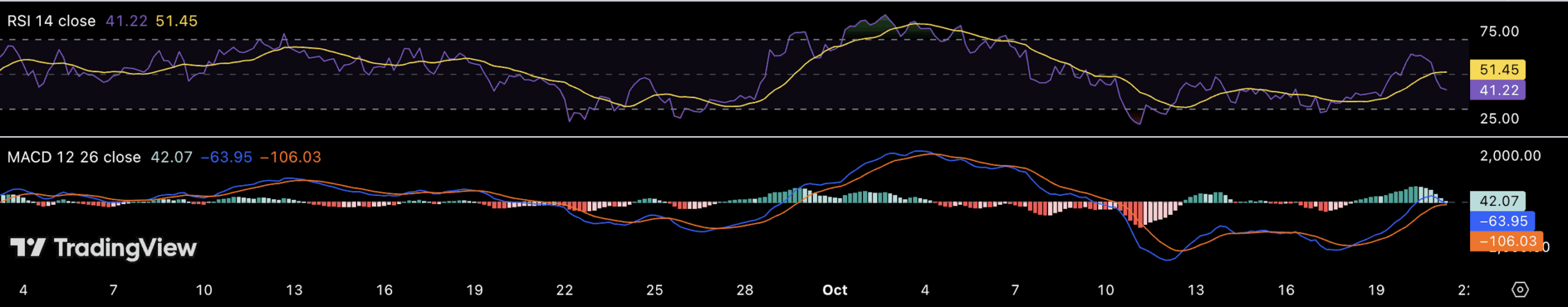 四小时图显示动量指标呈现看跌情绪。相对强弱指数(RSI)位于41附近,显示买盘力量有限;而MACD柱状图转负,暗示可能出现更深回调。