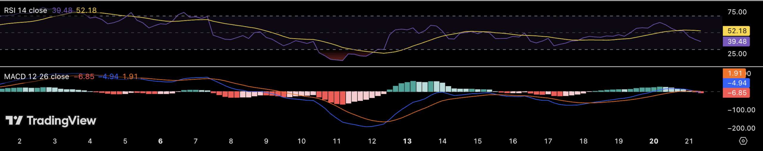 技术指标显示疲态加剧:RSI跌破40预示看跌动能可能延续,MACD指标形成死叉表明下行压力占主导。
