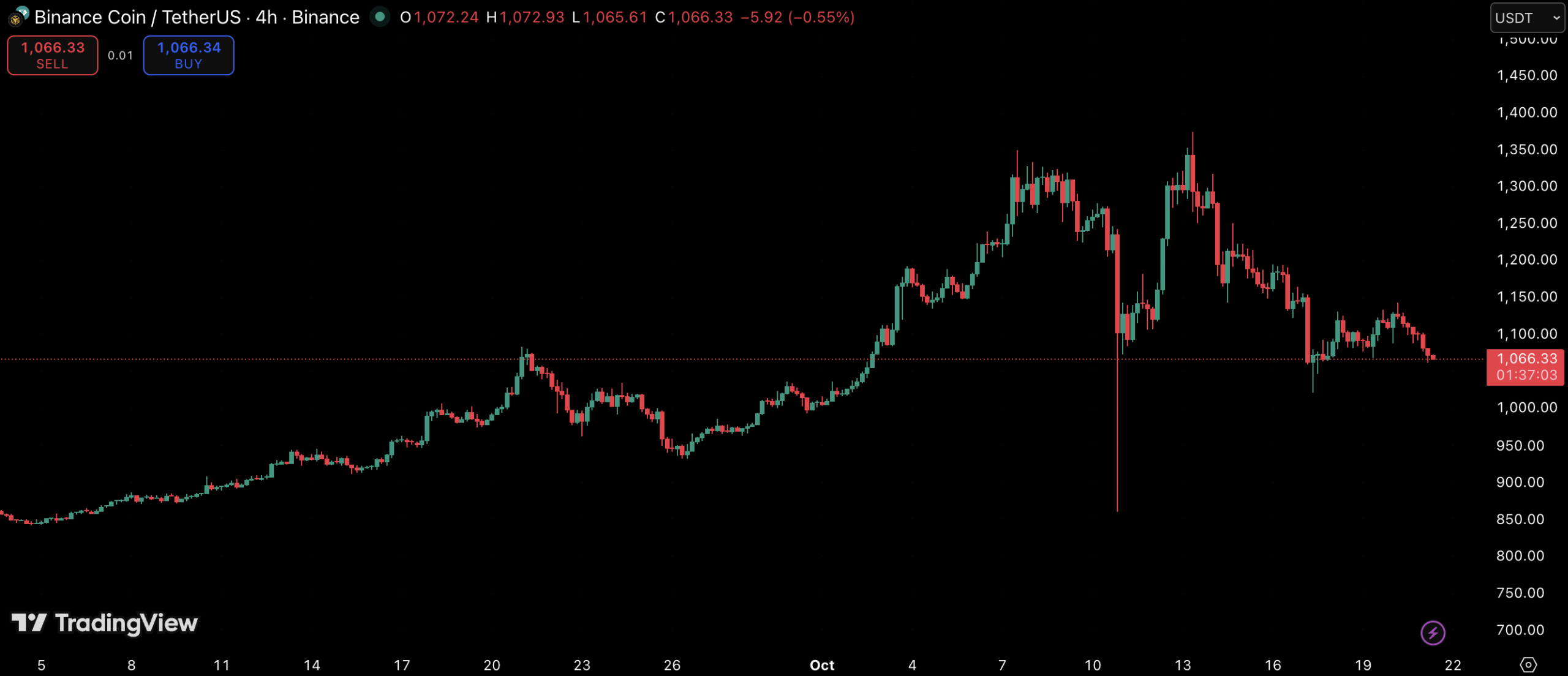在十大加密货币中,BNB成为最大输家之一。该代币24小时跌4.7%,本周跌幅超10%,现报1,070美元附近。