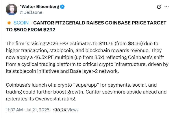 Cantor Fitzgerald指出,上调预期主要基于Coinbase在交易手续费、稳定币及区块链奖励收入的增长潜力。该机构采用46.5倍市盈率估值(原为35倍),认为Coinbase正从周期性交易平台转型为关键加密基础设施,并特别肯定了其在稳定币生态和Base二层网络中的战略布局。