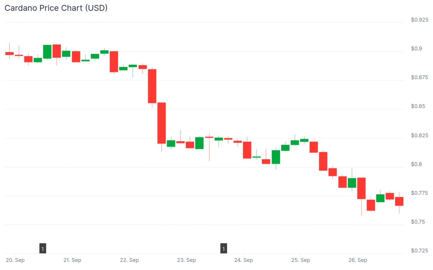 卡尔达诺周线价格图表显示,若买方支撑稳固,ADA有望冲击1.03美元关口。虽然当前价格低于1美元,但其不断深化的DeFi生态和ETF进展为长期持有者带来乐观预期。