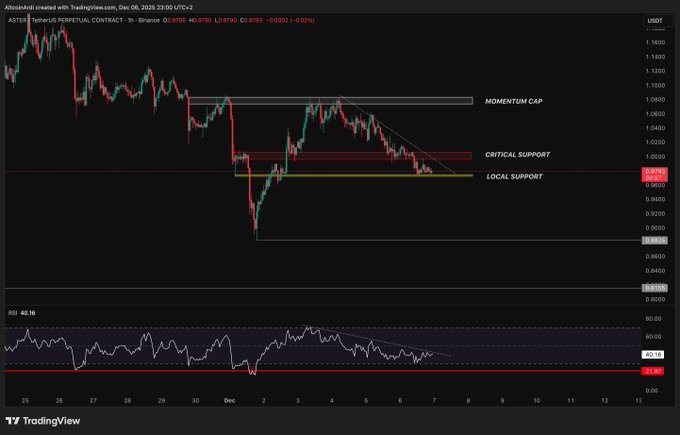 随着市场持续走弱,Aster正徘徊于脆弱的技术区域。近期回调形成紧缩结构,交易员正密切关注当前支撑区域能否承受持续卖压。