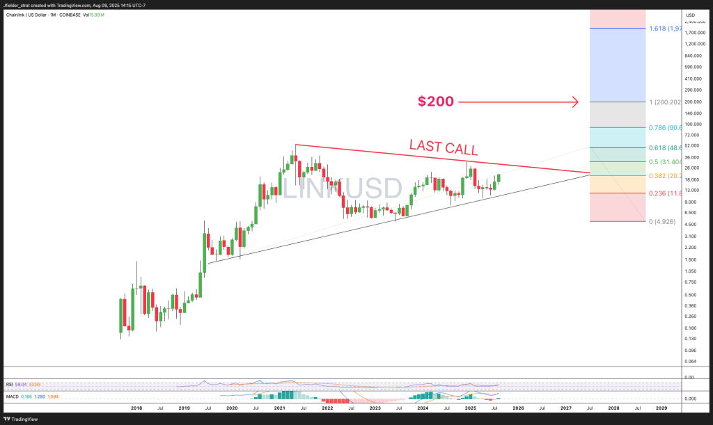 Fielder的图表显示LINK长期处于上升三角形形态内,红色"最后防线"趋势线构成关键阻力位。若能有效突破该位置,价格可能加速上行。